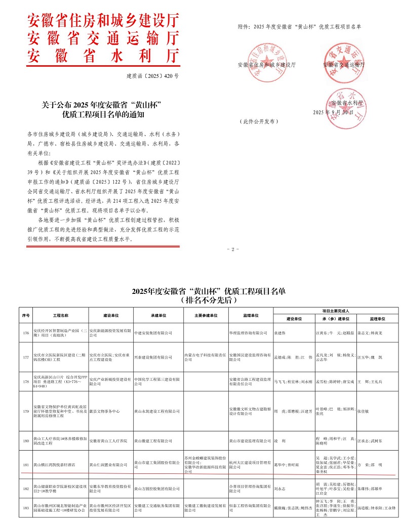 近日,安徽省住房和城鄉建設廳、安徽省交通運輸廳、安徽省水利廳聯(lián)合公布了2025年度省“黃山杯”優(yōu)質(zhì)工程項目名單,黃山市建工集團承建的黃山橫江灣凱悅嘉軒酒店項目成功入選,榮膺安徽省建設工程質(zhì)量最高榮譽(yù)——“黃山杯”獎。
